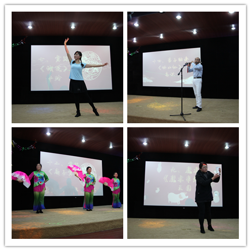 精彩的笛子独奏《紫竹调》拉开了联欢会文艺表演的序幕。老师们各显其能,大展才艺,节目内容丰富多彩。有歌曲演唱《千千厥歌》、《我爱你中国》、《祈祷》和《隐形的翅膀》、也有诗词朗诵《我愿意是激流》、杂技表演《花样毽子》和精彩的魔术表演。舞蹈《绒花》《扇子舞》展现了女教师们曼妙的身姿,将现场气氛推向高潮。互动游戏更是让大家兴致高涨、嗨翻全场。精彩的节目演出在悠扬的笛子独奏《映山红》中结束。