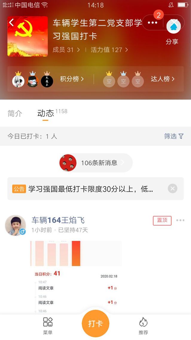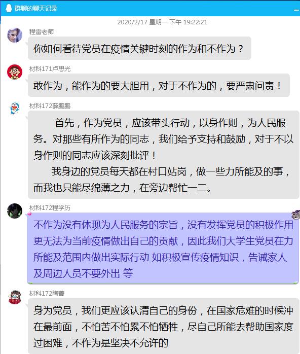 开展网络主题党日,切实强化党员意识 机械专业学生党支部书记吕寅老师组织制作《新型冠状病毒基础知识问卷调查》,让支部同志通过网络平台QQ、微信群等进行宣传和分享,得到良好的防控知识普及和宣传作用。支部学生党员以网络支部大会讨论的形式,由三个党小组分工完成关于新型冠状病毒宣传视频的制作任务。材科专业学生党支部书记程雷老师组织开展了题为“如何看待党员在疫情关键时刻的作为和不作为”的主题党日,党员同志们纷纷参与讨论,大家纷纷表示:身为党员,我们更应该认清自己的身份,在国家危难的时候冲在最前面,不怕苦不怕累不怕牺牲,尽自己所能去帮助国家度过难关。车辆专业学生第二支部书记吴敏老师要求支部党员在家期间要自觉利用学习强国平台,加强理论学习,并成立打卡群,实行专人管理,重点在于通过理论学习,加强交流,统一思想,增强政治觉悟和基本素养,使支部中形成良好的学习热潮。