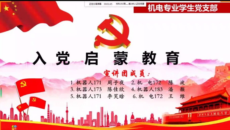 针对00后在入党动机和入党信念上出现的新变化,为进一步引导大一学生积极向党组织靠拢并树立正确入党动机,4月5日下午,6165金沙总站官方入口机电专业学生党支部宣讲团成员通过QQ直播为19级材控、材科、机械电子专业学生开展在线入党启蒙教育。活动由支部书记杨栎模主持。