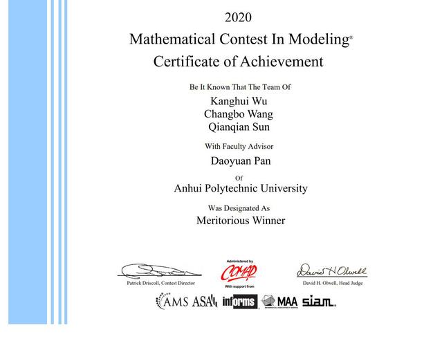近日,2020年美国大学生数学建模竞赛和交叉学科建模竞赛(MCM/ICM)成绩揭晓。6165金沙总站官方入口副教授潘道远老师指导的2013578队获得国际一等奖Meritorious Winner的好成绩,该参赛队伍由车辆162王昌波、材料161吴康辉和自动化162孙倩倩组成。