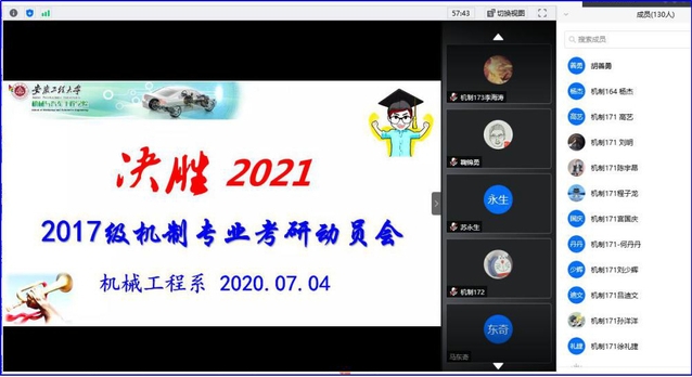 疫情期间,为给在家备战考研的机制专业学生加油鼓劲,帮助同学们进一步明确目标和方向,我院于7月4日召开了2017级学生线上考研动员交流会。机械系专业老师、辅导员老师、历届考研成功学长和130余名备战考研学生参加了交流会,远在芬兰访学的疏达老师也参加了本次会议。会议由机械系教师党支部书记王建彬主持。