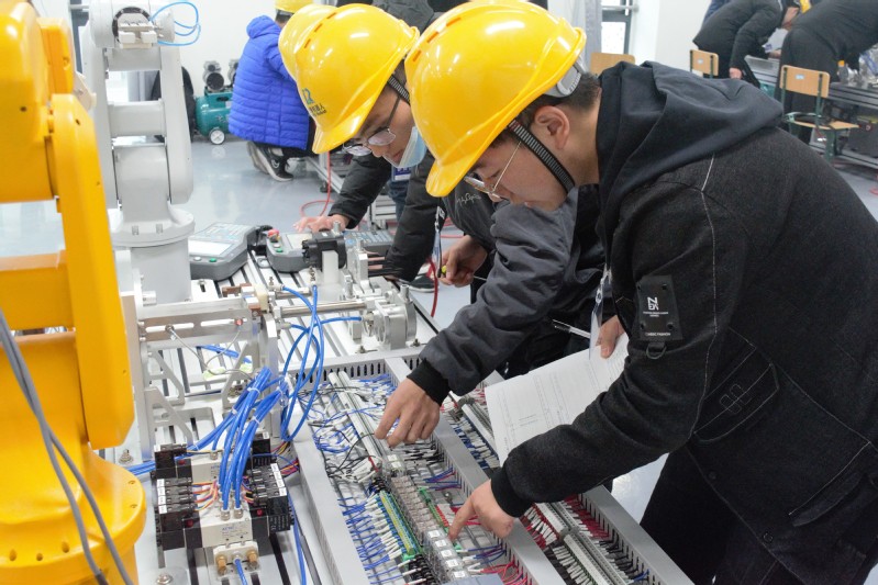 按照安徽省教育厅和学校有关疫情防控工作的具体要求,大赛筹备组提前对赛事各环节进行了精心部署,严格落实疫情防控要求。比赛内容为双机器人协同作业完成滚动轴承的自动装配,每队由2至3名选手组成,要求选手在规定时间内完成PLC与两台机器人间通讯建立、I/O口分配、电气连接,PLC和机器人程序编写与调试以及机器人动作示教工作,重点考察选手组建机器人协同作业系统的综合能力,以及机械、电气、气动和控制的综合装配和调试技能。据了解,本次决赛所使用的滚动轴承自动装配单元为我校与芜湖安普机器人产业技术研究院联合研制。该装配单元基于机器人协同作业的工业应用场景,以滚动轴承自动装配作业任务为对象,是一个集机械、电子、气动、控制、工业机器人于一体的多功能综合平台。芜湖人本轴承为本次大赛提供了滚动轴承成套零件。
