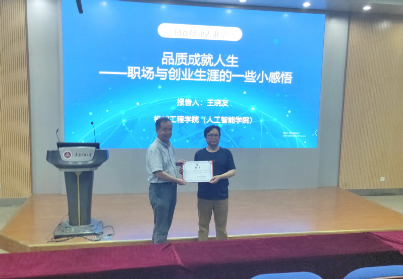 6月2日,我院邀请1985级机制专业校友,现任铜陵市万达设备制造有限公司总经理王晓友回母校交流并做创业报告。报告会在5J117报告厅举行,学院党委书记伊长文出席报告会,2019级和2020级部分学生参加了报告会。报告会由学院党委副书记李文江主持。报告会开始前,伊长文为王晓友颁发了我院大学生创新创业导师聘书。