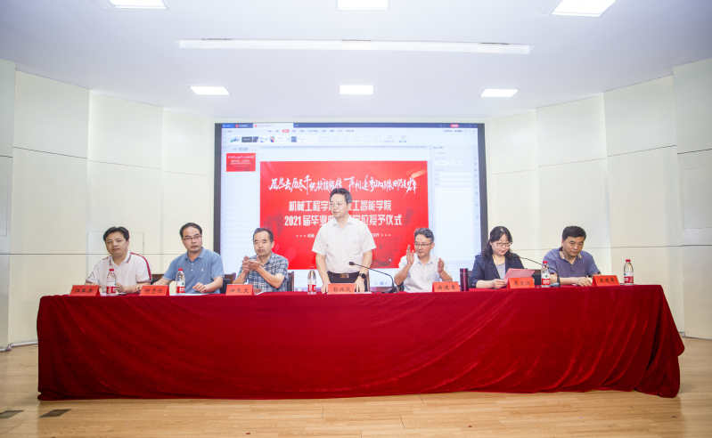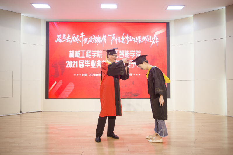 仪式中,学院党委副书记何志恒宣读了《安徽省普通高等学校优秀毕业生》名单和《安徽工程大学2021届优秀毕业生》名单,教师代表裴九芳、毕业生代表李晨静、在校生代表杨怡欣上台发言。许德章为毕业生扶正流苏并合影留念。