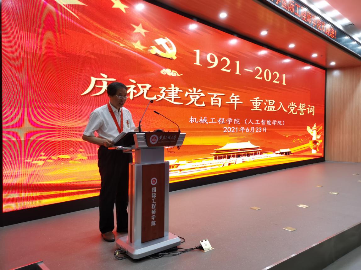 为庆祝中国共产党成立100周年,深入推进党史学习教育,6月23日下午,我院(人工智能学院)在国际工程师学院大报告厅举行“庆祝建党百年,重温入党誓词”主题党日活动。学院党委副书记李文江、教师党员代表、2018和2019级全体学生党员以及研究生支部党员代表参加党日活动,活动特别邀请离退休党委苏自林老师参加。活动由学生支部书记王海燕主持。