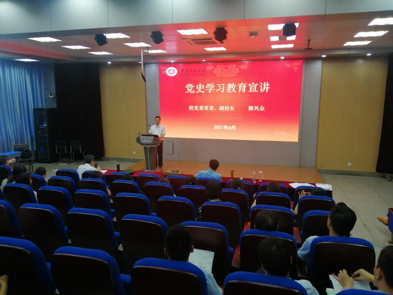 宣讲会上,郭兴众从“深入学习领会习近平总书记关于党的历史的重要论述”入篇,深刻阐述了开展党史学习教育的重大意义。他用“开天辟地、改天换地、翻天覆地、惊天动地”四个关键词深刻阐述了中国共产党百年奋斗的光辉历程和历史性贡献。他要求,党史学习教育要认真研读党史基本著作,要学懂弄通做实习近平新时代中国特色社会主义思想,增强“四个意识”、坚定“四个自信”、做到“两个维护”,做到学史明理、学史增信、学史崇德、学史力行,在学习领悟中坚定理想信念,在奋发有为中践行初心使命。要把党史学习教育与“立德树人”根本任务紧密结合,争做“四有”好老师,潜心教书育人,提升人才培养质量,提升服务地方经济社会发展的能力。要以实际的工作成效来检视党史学习教育的实际效果。