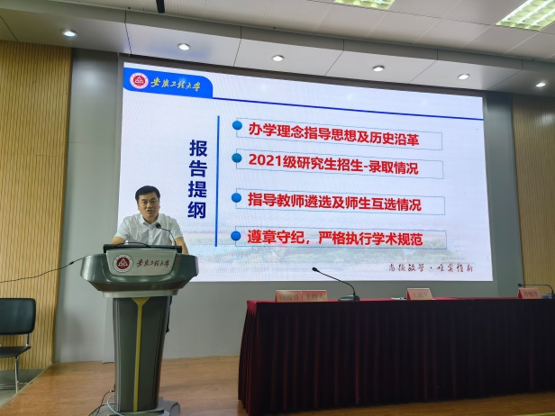 在入学教育环节,许德章代表学院领导向2021级研究生能够通过自身努力如愿考取研究生表示祝贺详细介绍了学院的学科体系、特色和优势他希望各位研究生新同学能够珍惜学习的机会,立足新起点、迎接新挑战、力争创新成绩要求同学们调整状态,在新的学习阶段要有明确的奋斗目标,“人”和“治学”两不误。王建平介绍了学校的办学理念指导思想以及学院研究生培养的历史沿革,要求同学们牢记“三做”理念,不忘初心,努力学习,争做德智体美劳全面发展的新时代担当青年,随后他还向同学们通报了2021级研究生的招生-录取情况、指导老师遴选及师生互选情况,同时要求大家严格遵守学校的管理规章制度和纪录,严守正确的学术道德与学术规范,并跟同学们分享了一些学术不端的案例,教导同学们要端正学习和研究的态度。研究生秘书吴路路老师从研究生管理、培养方案、培养计划、课程设置、毕业要求、奖助体系等方面同学们做了细致全面的讲解。
