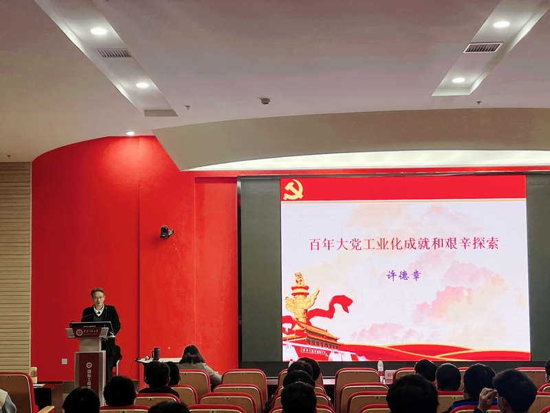 许德章带领同学们系统梳理了新中国成立以来我国工业发展历程与成就。许院长指出,近代以来,如何把中国这样一个落后的农业国建设成为一个发达的工业国,实现工业化,是众多仁人志士为之奋斗一生的伟大梦想。历史表明,这个梦想只有在中国共产党领导的新中国才可能实现。作为新时代青年大学生,作为青年群体中的中坚力量,广大同学应心存“志气”、褒有“勇气”、涵养“大气”,坚决发扬“铁人王进喜”“最美奋斗者时传祥”等老一辈革命先烈精神,奋力拼搏,以实现中华民族伟大复兴为己任,不辜负党的期望,不辜负人民的期望,不辜负我们这个伟大时代。