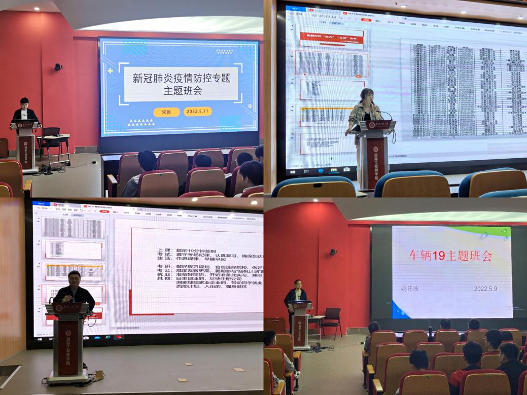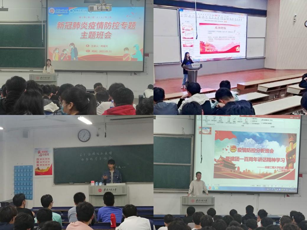 在班会上,各年级辅导员领学《中央政治局常委会召开会议 分析当前新冠肺炎疫情防控形势》,组织同学们学习习近平总书记给北京科技大学老教授的回信精神、在中国人民大学考察时的重要讲话精神、在庆祝中国共产主义青年团成立100周年大会上的重要讲话精神,传达《关于准确适应疫情形势变化有序做好平战转换工作的通知(皖教防控〔2022〕15号)》和芜湖市《关于落实重点场所常态化疫情防控措施的通告》等文件精神,向全体同学提出四点要求:一是严守纪律规矩,克服侥幸心理,认真落实常态化疫情防控要求,切实做好每日信息汇报,严禁未经批准私自外出;二是端正学习态度,夯实专业基础,提前做好个人职业生涯规划,争当锐意进取、担当实干的新时代青年;三是重视宿舍卫生,做好个人防护,当好自我健康的第一责任人,打造安全卫生、学风优良、和谐文明的宿舍新态;四是积极调整心态,加强体育锻炼,乐观面对生活,适当运动,不断提高心理调节与适应能力。