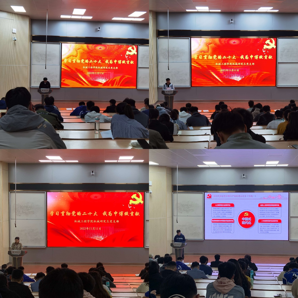 为学习宣传贯彻党的二十大精神,进一步激励学院研究生为学校博士立项单位建设贡献力量,11月11日,我院研究生四个党支部联合学习研讨会在2J报告厅举行,我院院长王建平和研究生全体党员参加研讨会。会议由机械研第一党支部书记程雷主持。