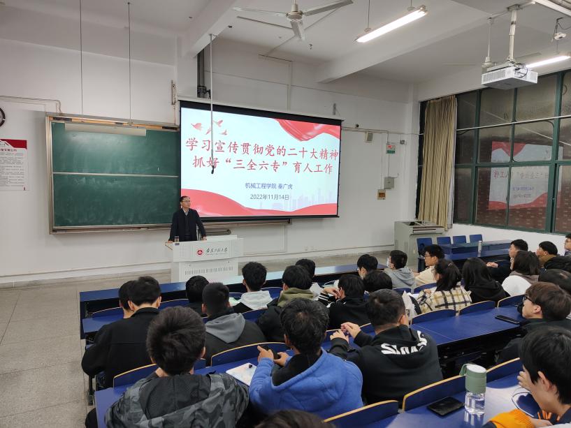 宣讲会上,秦广虎重点领学了二十大报告中关于青年与教育的论述,阐述了青年工作与教育工作对于党和国家的重要性,他希望青年学子们能够认真学习领悟党的二十大精神,从中汲取奋进力量,自觉肩负起历史使命,争做有理想、敢担当、能吃苦、肯奋斗的新时代好青年。为了帮助学生们更好地了解学校关于本科个性化人才培养改革的实施方案要义,秦广虎从学校党委“三全六专”工作任务及学院的相关工作部署入手进行讲解,他指出,“青年学子成长成才”始终是学校和学院所有工作的出发点和落脚点,不仅教师要坚持扎根育人沃土,青年更是要发挥好自己的主体作用,尤其是学生骨干,要积极参与并引领青年参与到学院的建设中来,为学院发展贡献出自己的青春智慧。