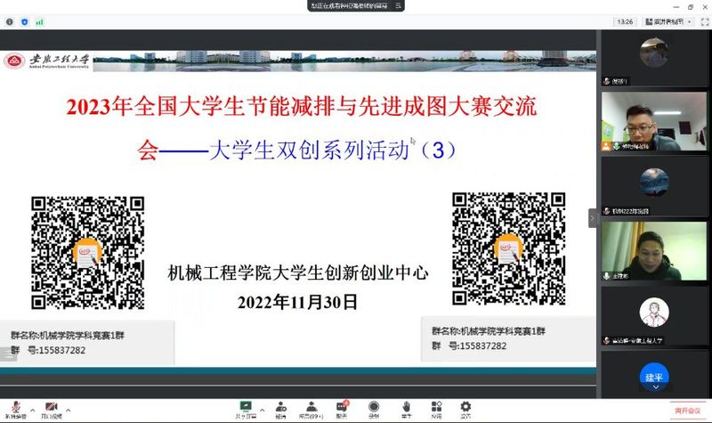 11月30日晚上,我院通过腾讯会议召开2023年全国大学生节能减排与先进成图大赛交流会。学院副院长王建彬、大学生双创中心主任钟相强、教师崔珍珍、2020级、2021级和2022级部分学生参加。活动由钟相强主持。
