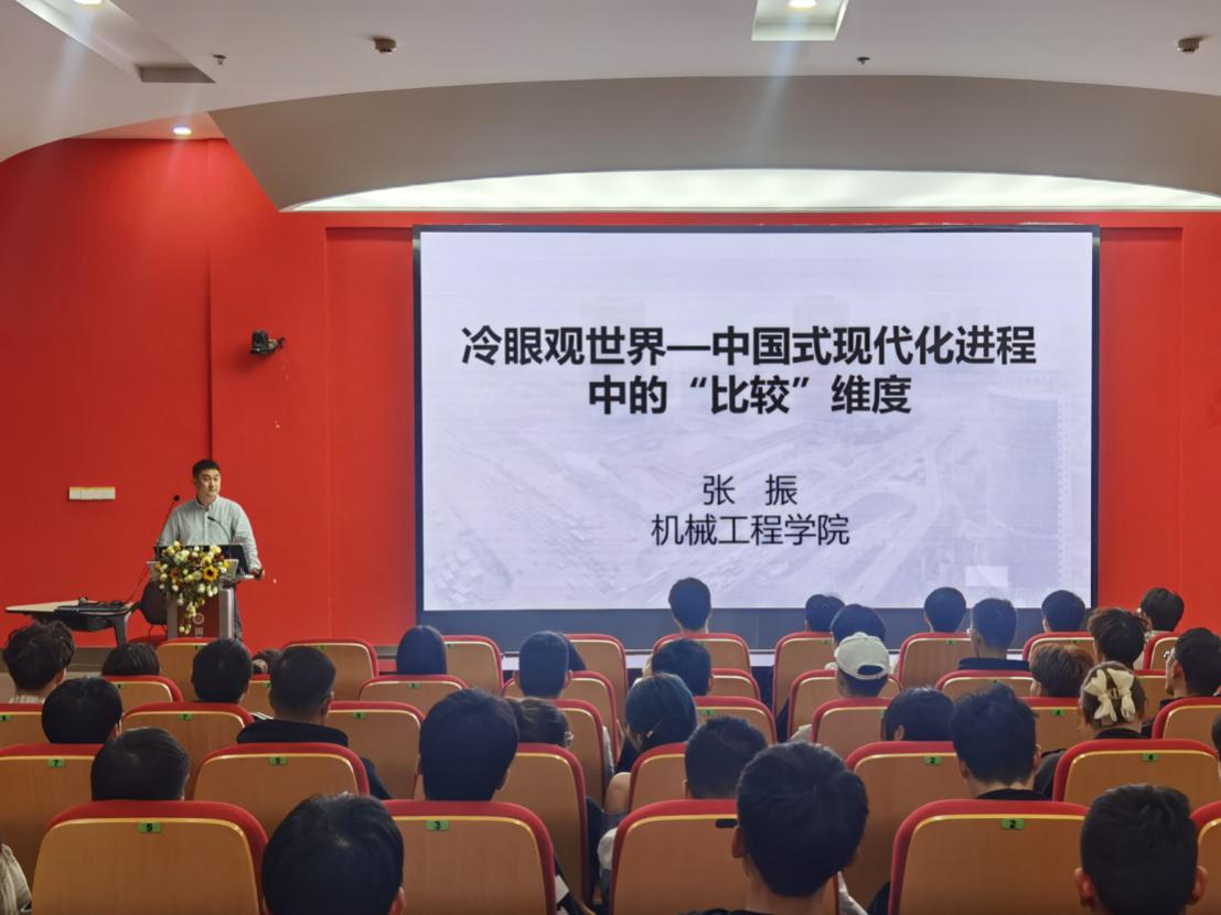 为拓展青年学子的国际化视野,努力造就理想信念坚定、专业知识扎实的有为人才,推动学生“正”起来、“学”起来,根据学院党建品牌建设活动安排,4月28日,我院在国际工程师学院小报告厅举办“党音嘹亮”大讲堂活动,邀请我院仪器系副主任张振副教授作《冷眼观世界——中国式现代化进程中的“比较”维度》专题讲座。学院大讲堂负责人时慕天、2021级入党积极分子100余人参会。讲座由时慕天主持。