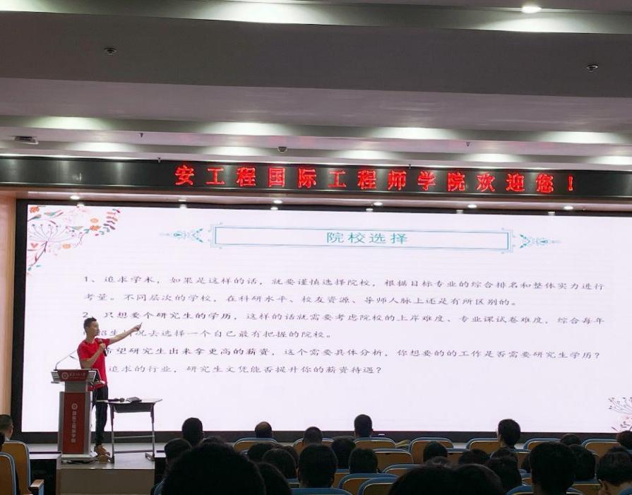 会议伊始,王安恒结合学院近三年的考研情况进行分析与讲解,就院校选择、备考策略、复习技巧等方面提出了自己的见解与建议,提醒同学们要全方位了解意向院校的情况,关注官方网站发布的信息。