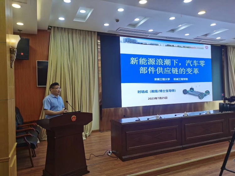 我院时培成教授和钟相强教授分别进行了“新能源汽车发展方向以及对供应链的影响”、“数字孪生技术-助力汽车零部件智能制造”专题讲座,由于讲座内容与宁国市主要产业高度契合,在场的企业家们全神贯注,聚精会神地聆听两位教授的精彩报告。