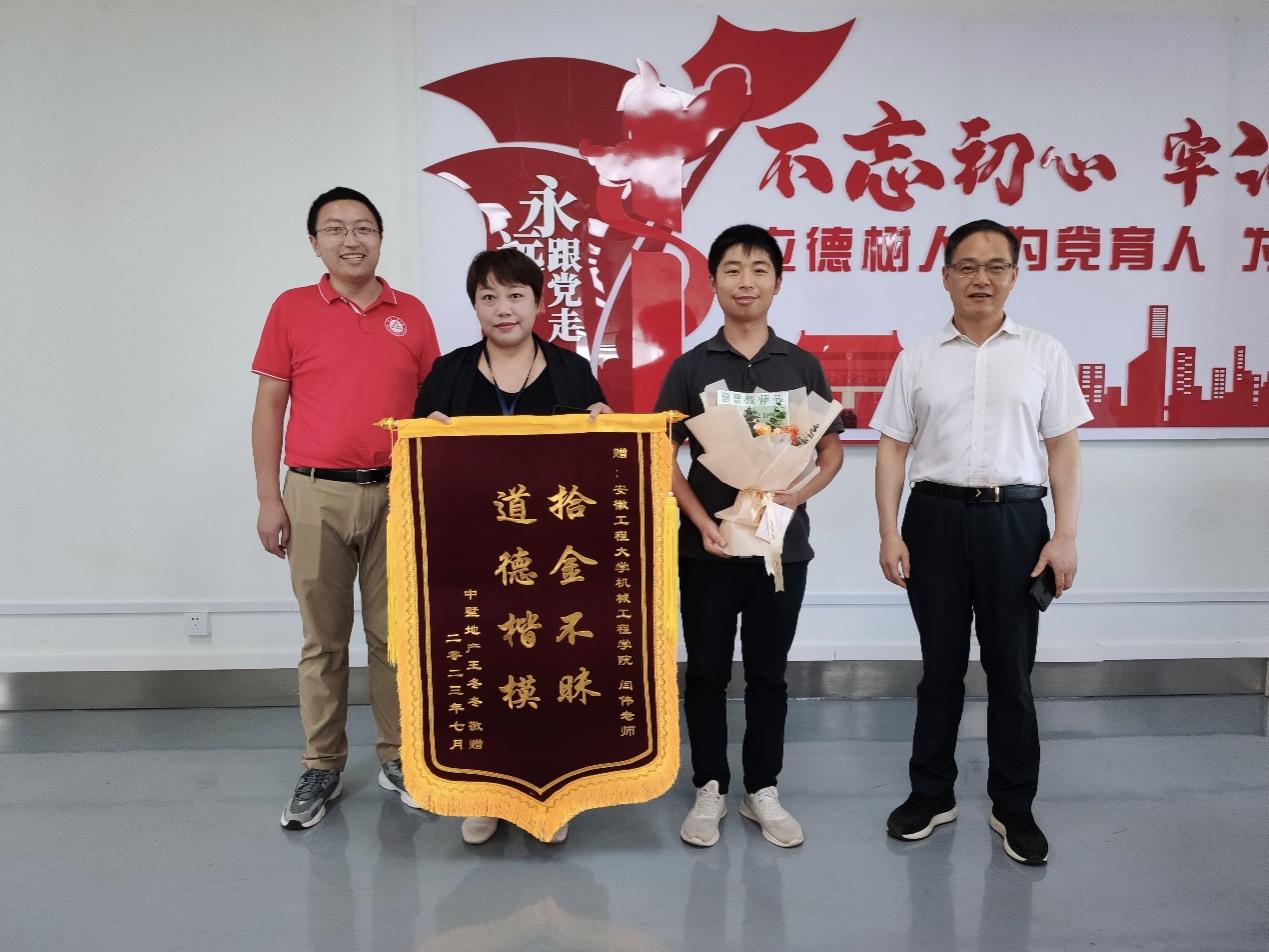 9月5日,校外王女士将一面写有“拾金不昧、道德楷模”的锦旗送到我院青年教师闫伟手中,对闫伟捡到王女士丢失的重要文件、帮助其挽回损失表示感谢,并称赞安徽工程大学老师品德高尚。
