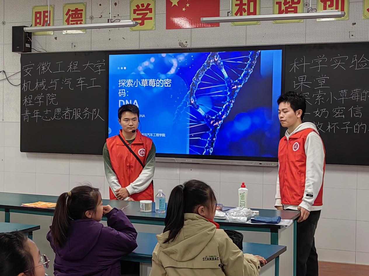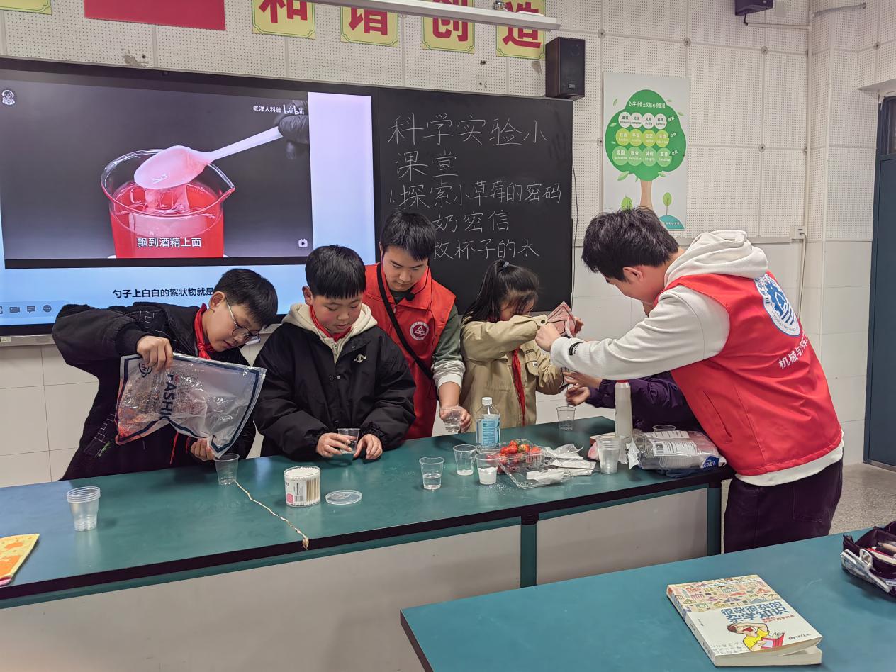 活动当天,志愿者们与小朋友们准时相约在实验室。第一个实验是“探索小草莓的秘密”,志愿者们向小朋友们科普了DNA的有关知识,然后便开始准备提取草莓的DNA,看着杯中慢慢产生的絮状物,小朋友们兴致满满。