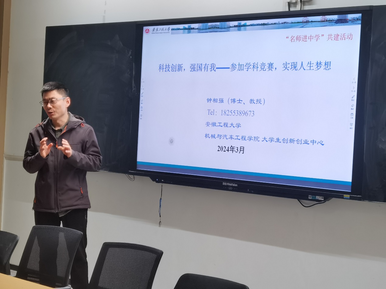 在合肥市第一中学教育集团(肥东分校),王建彬详细介绍了学校招生政策、专业设置及个性化人才培养特色等。大学生创新创业中心主任钟相强教授开展了题为“科技创新、强国有我——参加学科竞赛,实现人生梦想”名师进中学共建活动。合肥一中党委委员、副校长孙华,教师代表及部分同学参与了共建活动。