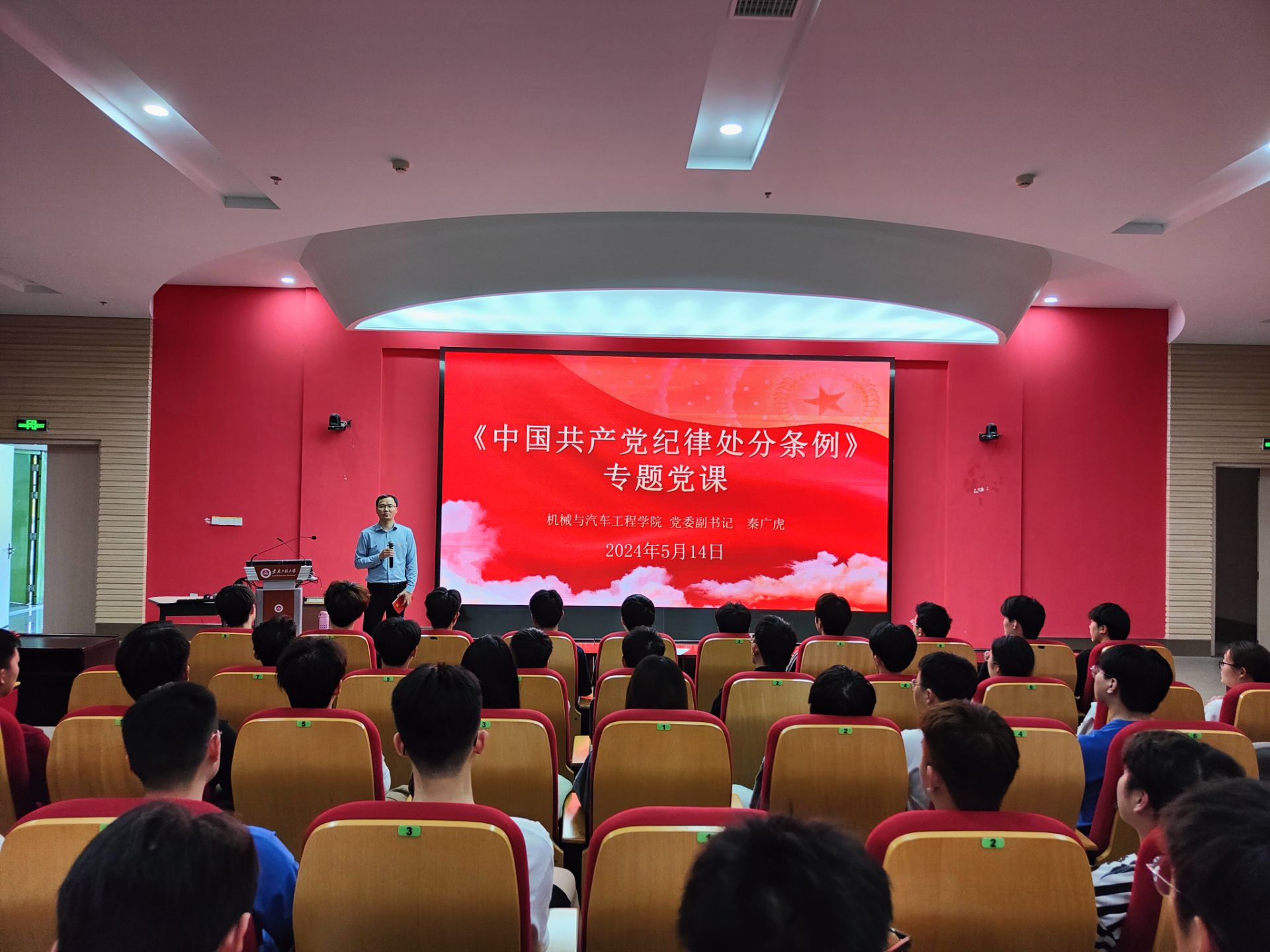 5月15日,6165金沙总站官方入口副书记秦广虎以“学纪、知纪、明纪、守纪”为题在国际工程师学院校区梦溪报告厅为本科生党支部上《中国共产党纪律处分条例》专题党课。机制专业学生第一党支部、机制专业学生第二党支部、测控专业学生党支部、车辆专业学生第一党支部、车辆专业学生第二党支部、交通工程专业学生党支部、机电专业学生党支部党员代表参加此次党课。
