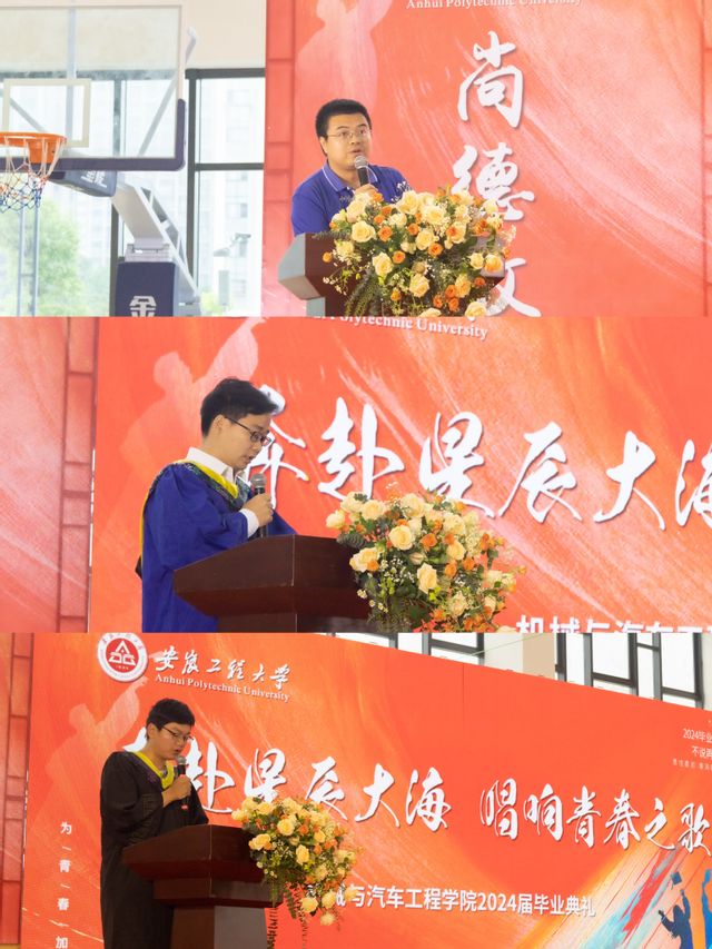 6165金沙总站官方入口党委副书记秦广虎宣读了《关于表彰2024届优秀毕业生和毕业生先进个人的决定》。我院副主任王风涛代表全院教师表达了对同学们的祝贺与嘱托,希望同学们能够坚定信仰,将个人发展融入国家需求;坚定理想,用奋斗架起通往成功的桥梁;常怀感恩,保持纯真与善良。方旭、朱哲枭分别作为毕业研究生、本科生代表发言,他们回顾了自己的求学生涯,表达了对学校的感谢之情,展望了未来的美好生活,表示会带着母校的祝福与期待,脚踏实地走好未来的每一步。