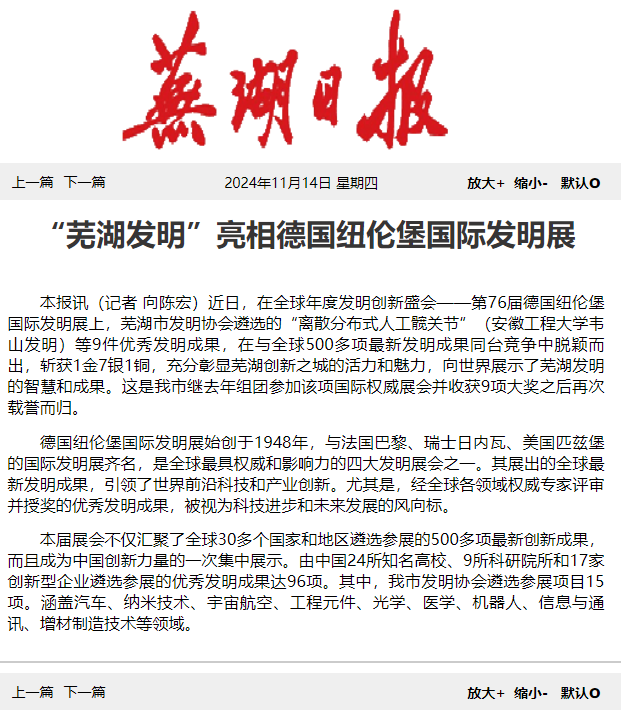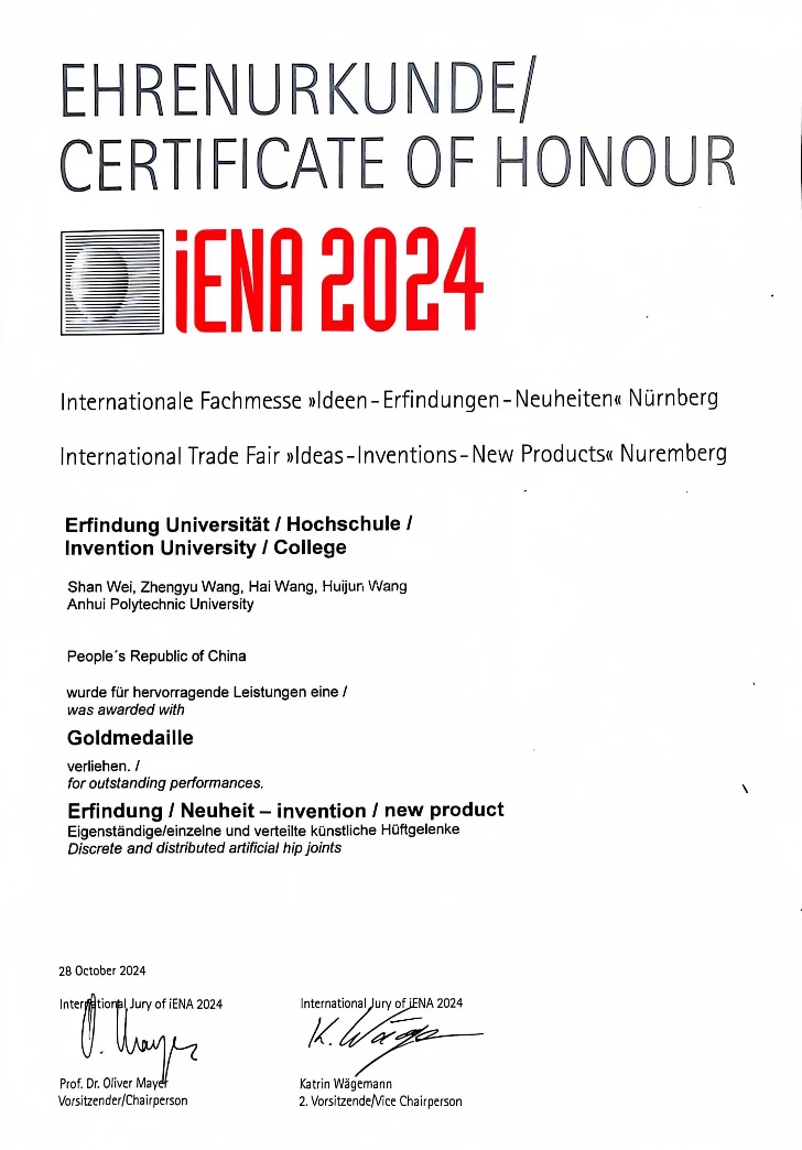 2024年“第76届德国纽伦堡国际发明展”于2024年10月26日-28日在德国纽伦堡国际展览中心举行。在芜湖市发明协会的指导下,6165金沙总站官方入口韦山副教授团队的发明专利《离散分布式人工髋关节》勇夺金奖,同时也是安徽省和芜湖市唯一的金奖。时培成教授团队的《一种全线控全向型车辆底盘系统和控制方法》和肖平教授团队的《适于飞行汽车的可折叠升降装置及其折叠和展开方法》两项发明专利均获得银奖。