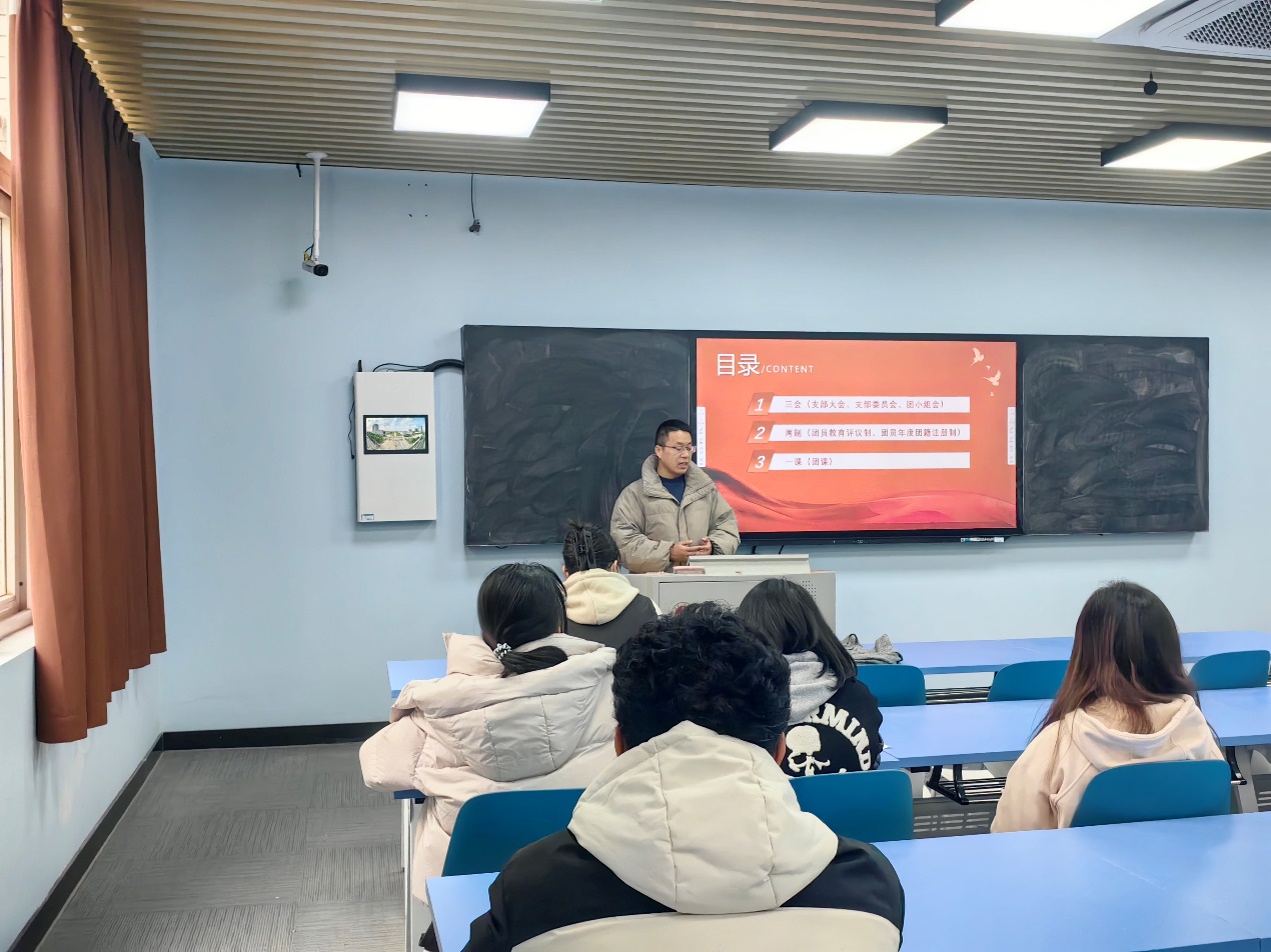 会议组织学习了《习近平在二〇二五年春节团拜会上的讲话》《国家主席习近平发表二〇二五年新年贺词》《中国共产主义青年团团员教育管理工作条例(试行)》。程雷首先对寒假开展的“返家乡”社会实践和“团百花”学雷锋志愿服务行动项目申报工作进行了总结,鼓励同学们积极参加社会实践活动,在实践中受教育、长才干、作贡献。他强调“三会两制一课”对于加强团组织建设、提高团员素质、增强团组织的凝聚力和战斗力具有重要意义。他指出“三会两制一课”是共青团组织生活的基本制度,通过开展“三会两制一课”,可以更好地教育引导团员增强团员意识;要求各团支部认真落实“三会两制一课”制度学习,加强团员思想政治教育,强化团员自身意识,增强青年团员的责任感和使命感,切实推进团组织规范化建设。学院团委学生副书记张慧慧带领学习了《关于召开2024年度组织生活会和开展团员教育评议的通知》,详细介绍了具体工作流程和要求,对组织生活会和团员教育评议结果录入“智慧团建”系统的操作方法进行了演示和培训。
