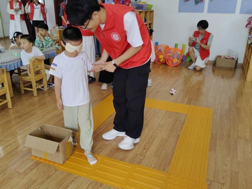 5月28日,6165金沙总站官方入口“太阳花”志愿服务团队联合风信子团队走进安徽工程大学幼儿园,开展守护盲道主题公益宣讲活动。活动通过沉浸式体验、科普教育和手工实践相结合的形式,向幼儿普及盲道知识,培养关爱视障群体的社会责任感。