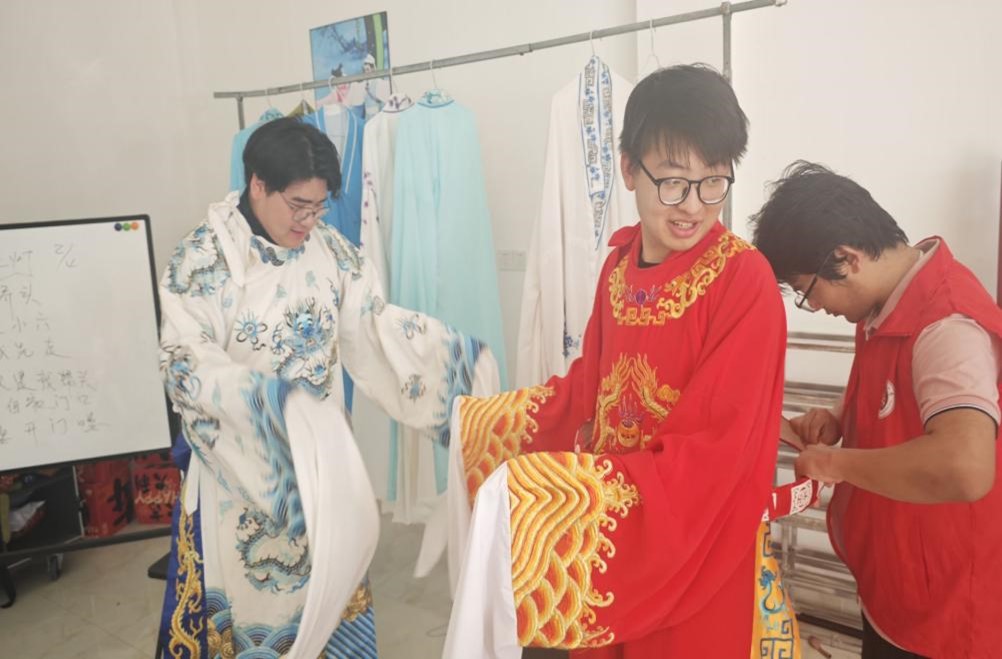 剧团团长亲自上阵,以经典《闹花灯》选段为例逐句教唱,细致分解唱腔韵味,强调衬词如“哪”、“啊”的婉转处理,并示范身段动作的配合。学生们从最初的拘谨逐渐放开,积极模仿一招一式。最令学子们兴奋的是戏服体验环节。服装师讲解完蟒袍、状元袍、小生服饰及各类盔帽的象征意义后,学生们分组试穿。穿上丞相蟒袍的同学被叮嘱“挺胸抬头显威严”,戴上状元帽的则惊喜发现帽翅随头摆动的巧思。身着华服学习台步亮相,沉浸式的体验让大家深刻体会到“台上一分钟,台下十年功”的不易。