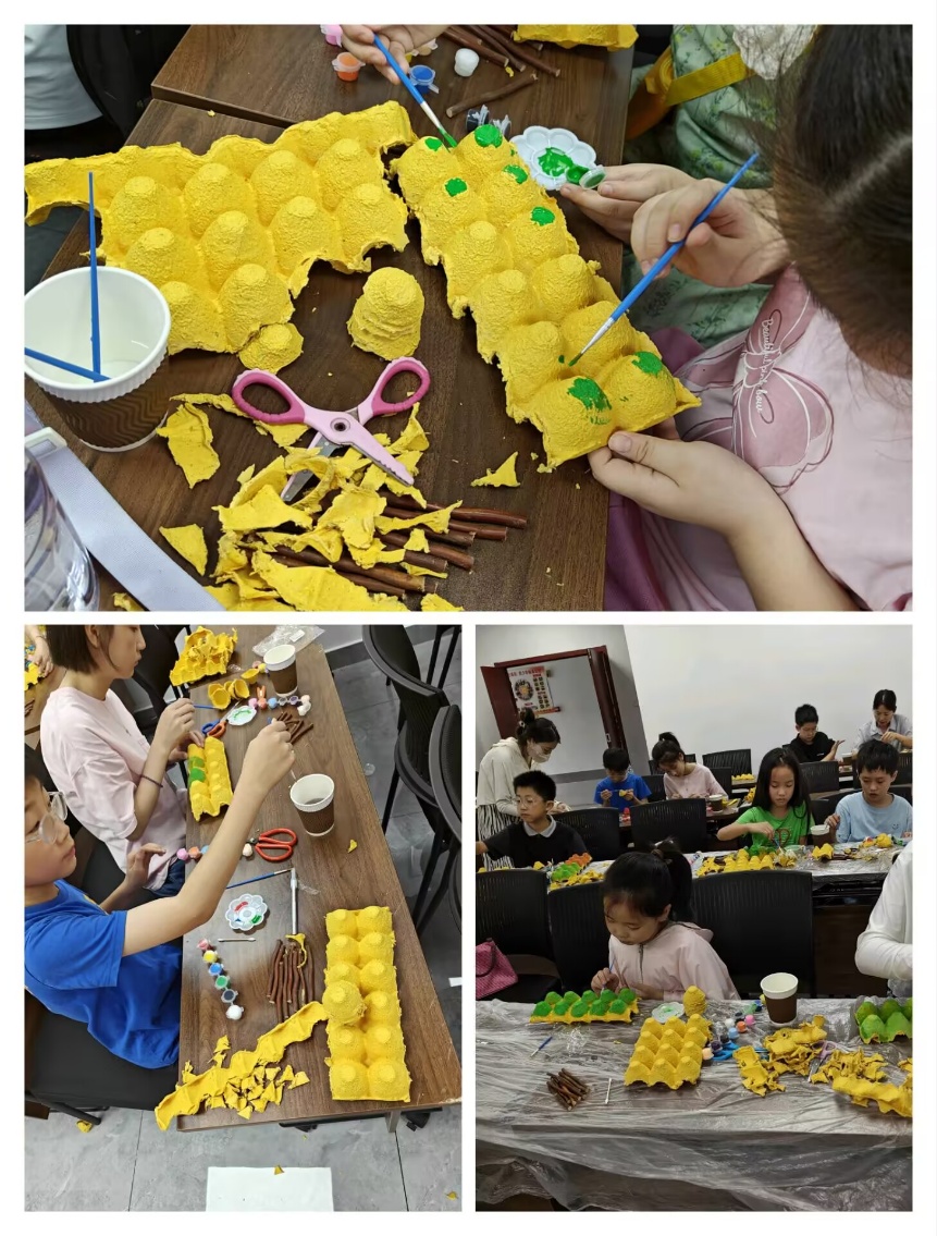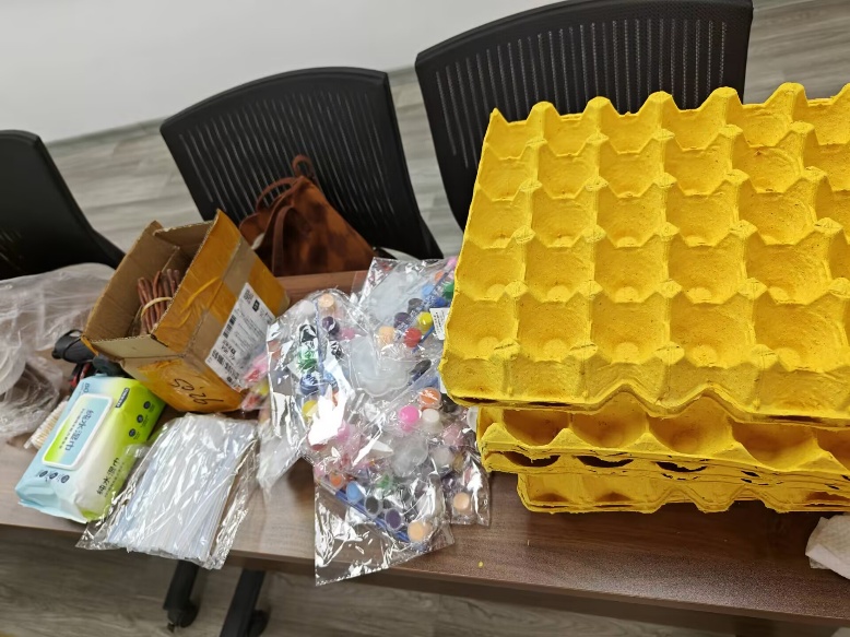 社区工作人员用生动的案例讲解了“变废为宝”的环保意义,告诉孩子们生活中的废旧物品通过创意改造,能焕发新的生命力。志愿者们逐一为小朋友分发颜料、小树枝和提前收集好的废旧鸡蛋托,这些看似普通的“垃圾”,在孩子们眼中瞬间变成了宝贝。