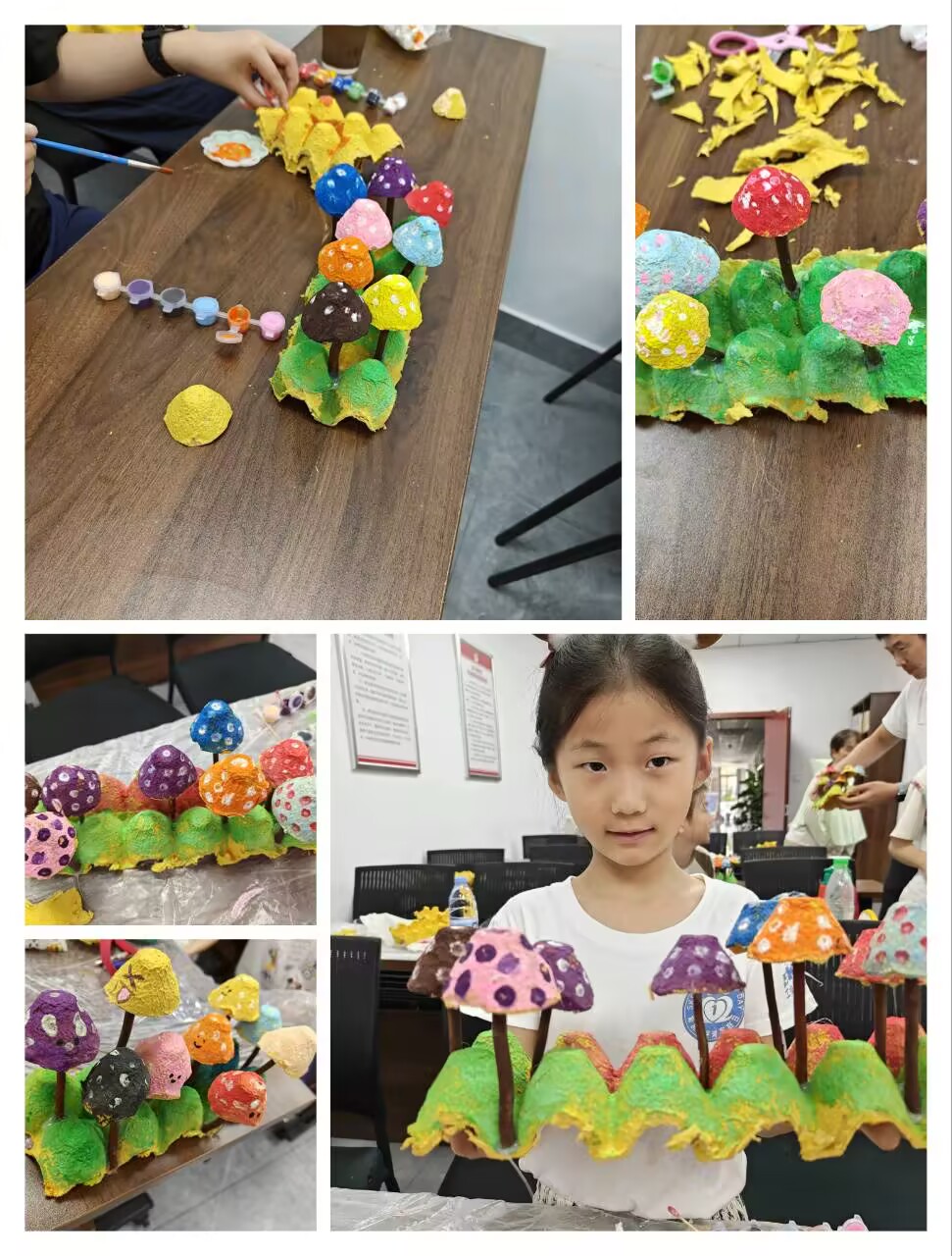 裁剪完成后,孩子们给作品上色环节。孩子们拿起画笔,蘸取五颜六色的颜料,在鸡蛋托上尽情发挥想象:有的把“蘑菇帽”涂成了红白相间的斑点样式,像极了森林里的野生蘑菇;有的给“小树丛”刷上渐变的绿色,仿佛雨后冒出的嫩芽;还有的大胆尝试紫色、蓝色等鲜艳色彩,创造出属于自己的“奇幻丛林”。原本黄扑扑的鸡蛋托,在孩子们的巧手下渐渐变得鲜活起来。