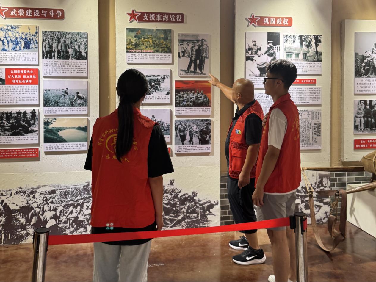 走进民俗馆,历史的气息扑面而来,志愿红与历史相遇。跟着讲解员的讲解,探寻“支援淮海战役”“巩固政权”的往昔,让红色记忆与农耕文化,在交流中鲜活起来。大学生志愿服务队成员们凝视“武装建设”“支援战役”的历史展板,先辈们的奋斗故事,在眼神交汇与倾听中,照进当下。我们身着志愿红,于历史图文间穿梭,感悟先辈热血,让红色传承在聆听中延续。